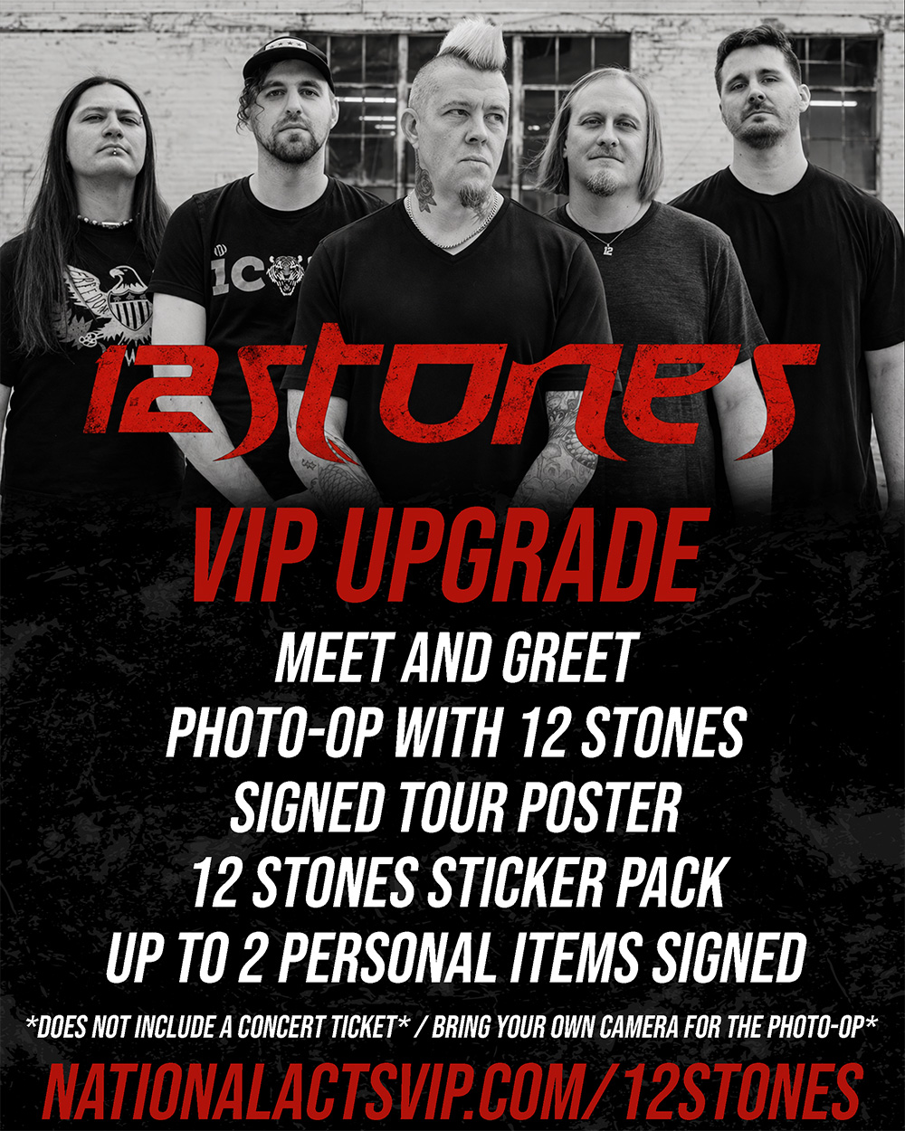 Please be aware that neither 12 STONES nor NATIONAL ACTS maintain any affiliation with the venue at which the band's performance is scheduled. The Meet and Greet packages are exclusively administered by 12 STONES on behalf of the band. Consequently, the venue will not possess any information regarding the Meet and Greet packages offered by the band. For inquiries concerning your Meet and Greet package, please direct your queries to National Acts HERE.