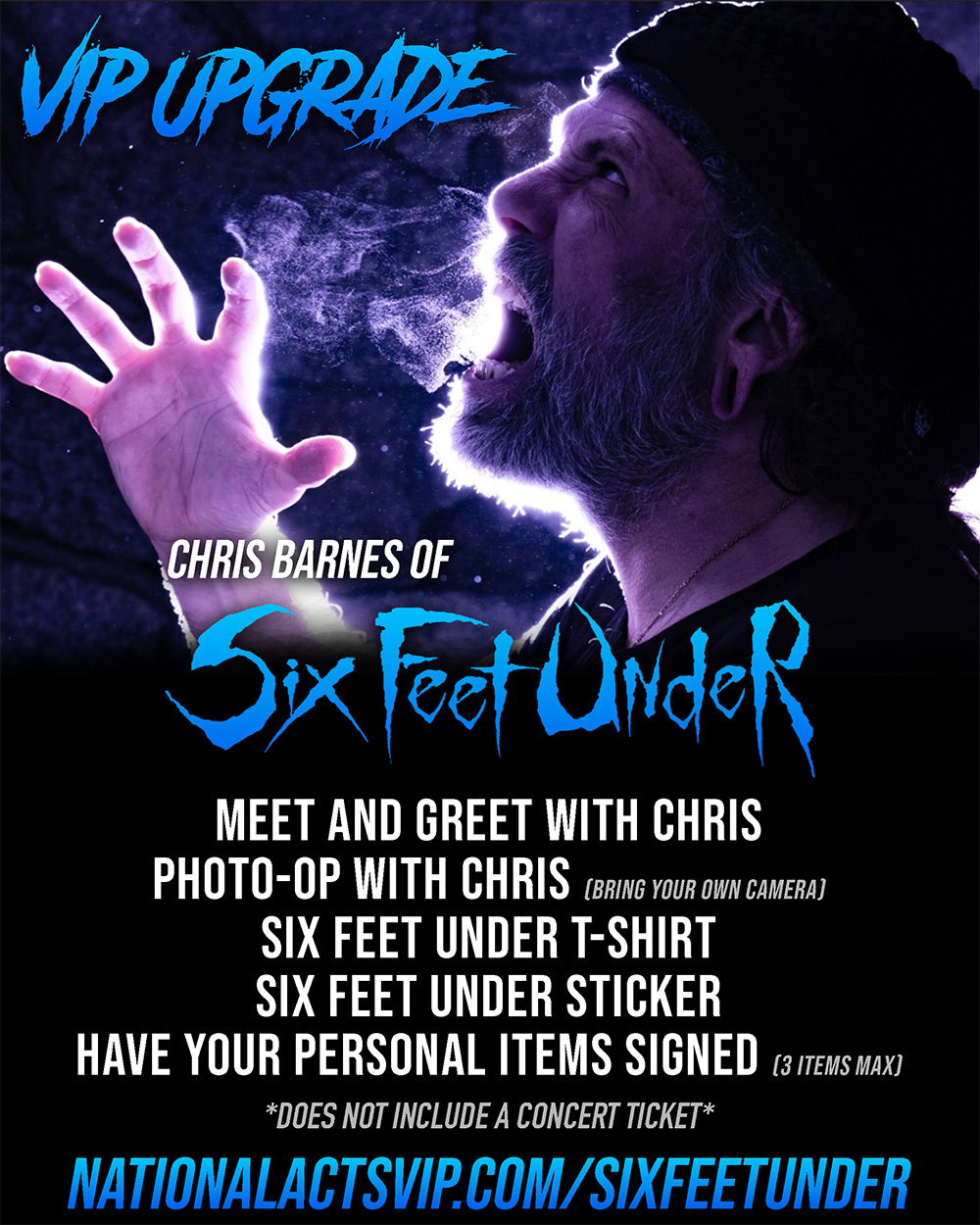 Please be aware that neither SIX FEET UNDER nor NATIONAL ACTS maintain any affiliation with the venue at which the band's performance is scheduled. The Meet and Greet packages are exclusively administered by NATIONAL ACTS on behalf of the band. Consequently, the venue will not possess any information regarding the Meet and Greet packages offered by the band. For inquiries concerning your Meet and Greet package, please direct your queries to National Acts HERE.