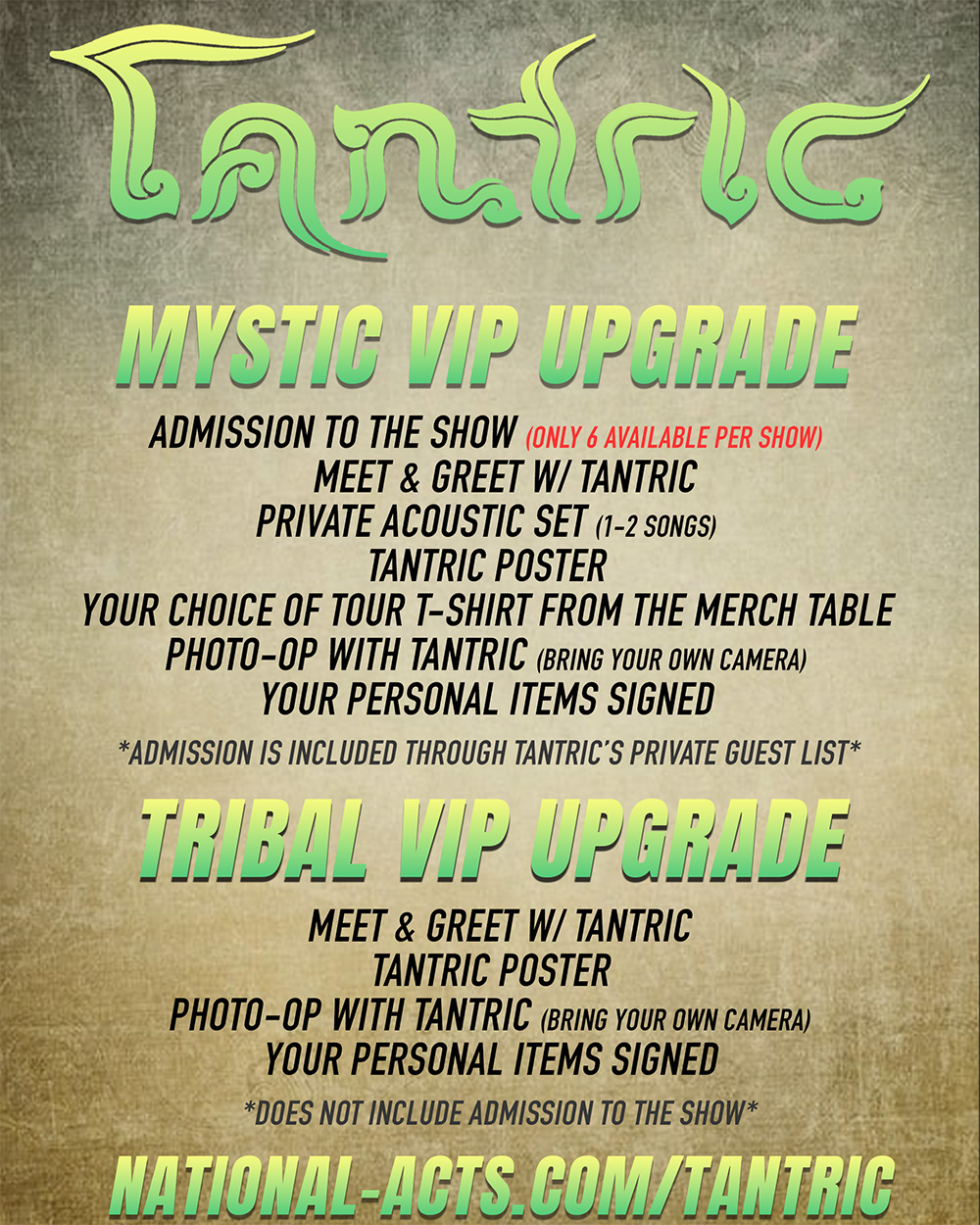 THE MYSTIC VIP UPGRADE includes admission for 1 as a member of Tantric's private guest list. A guest list spot is the equivelant of a standing room only, general admission concert ticket. No special or reserved seating is offered. Only 6 MYSTIC VIPs are available per show. When you arrive at the venue, your name will be on Tantric's guest list at the main entrance. Please bring your photo ID so they can match the name on the order.